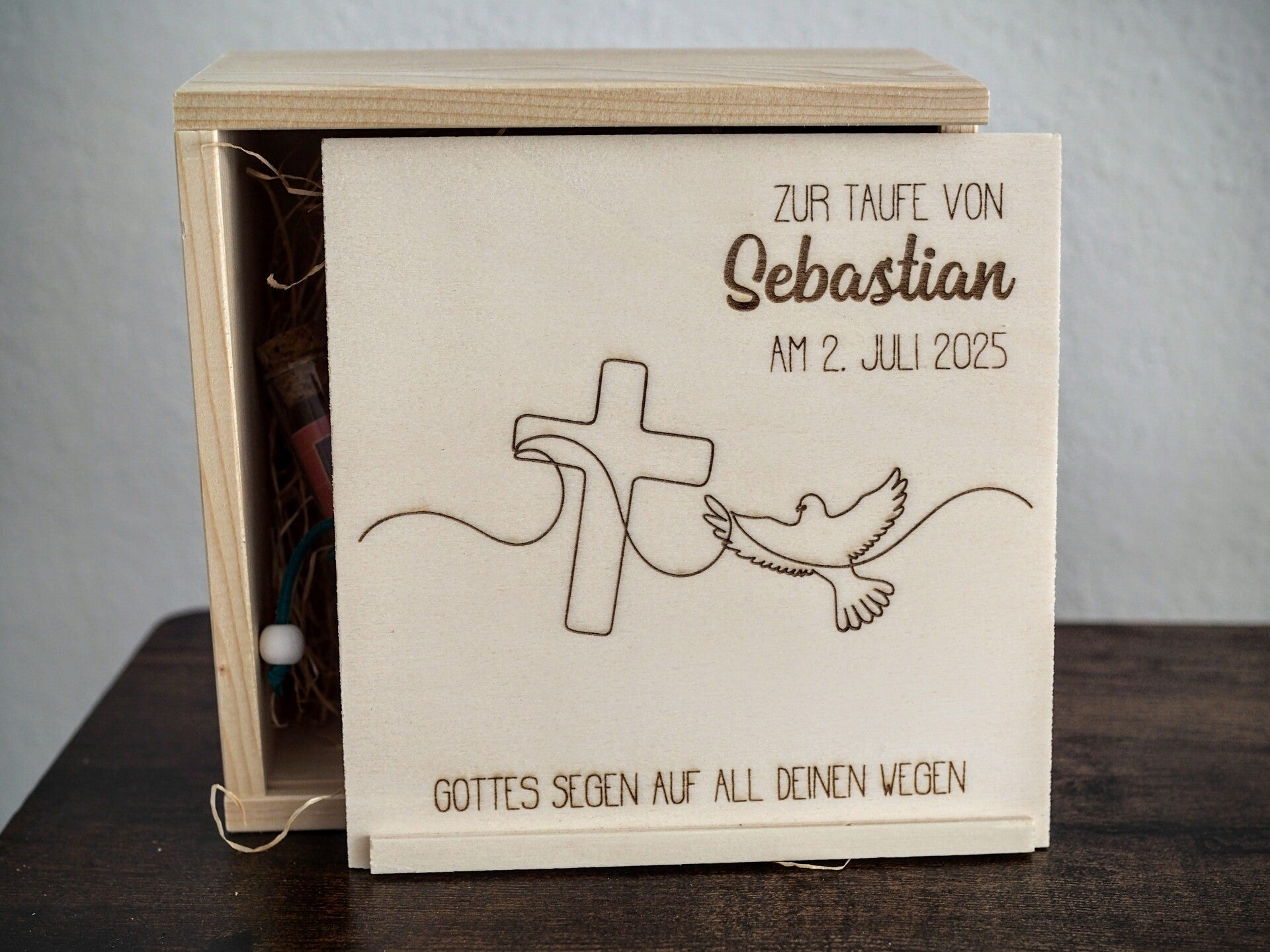 Die perfekte Verpackung für deine Geschenke zur Taufe. Der Deckel wird mit dem Namen des Täuflings sowie dem Taufdatum versehen. Box wählbar in 3 Größen.