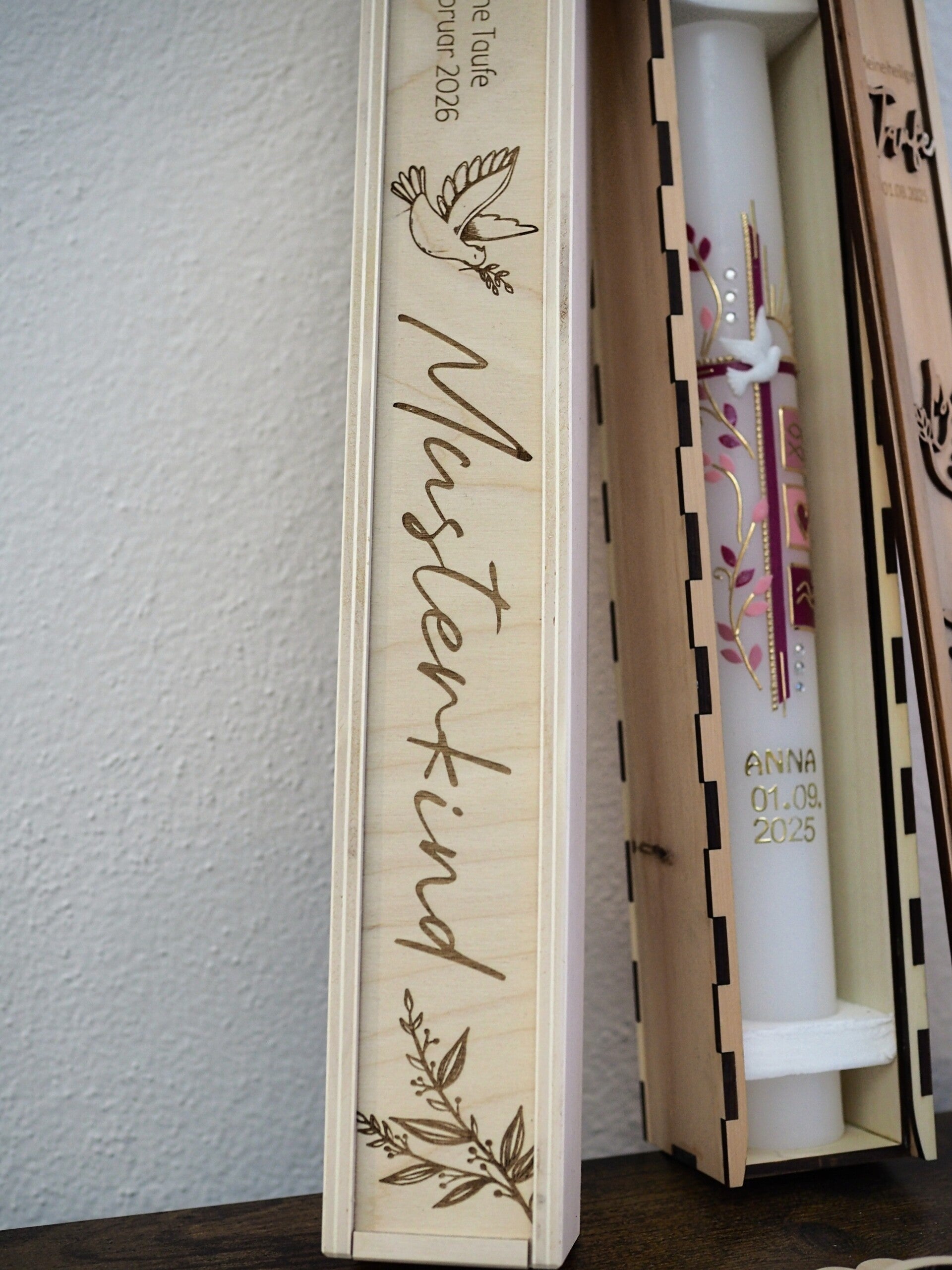 Schöner lässt sich eine Taufkerze nicht aufbewahren: Die Box aus Birkenholz wird mit Datum und Namen des Täuflings personalisiert.