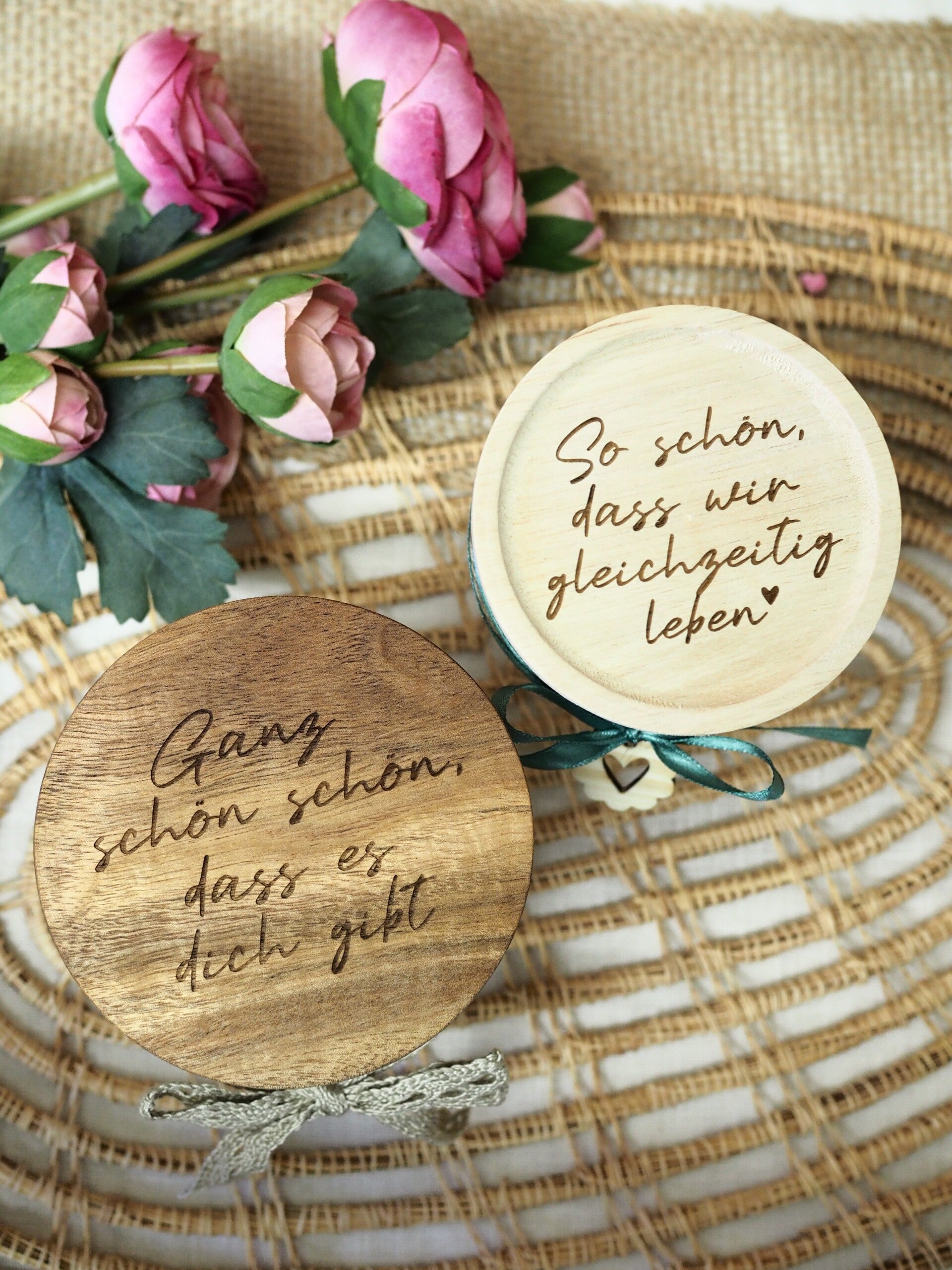 Glas inklusive Deckel, Schleife und kleinem Herzanhänger aus Zirbenholz. Erfolgt keine Farbauswahl der Schleife, wählen wir eine nach Verfügbarkeit aus.
